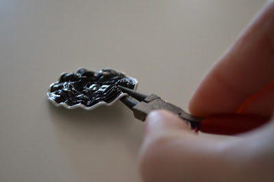 Cortas un trozo de alambre plateado, aproximadamente de 5 Cm. Con los alicates de punta redonda haces un espiral, y con la pistola de silicona o con un pegamento resistente, lo pegas sobre la superficie de una de las cápsulas.